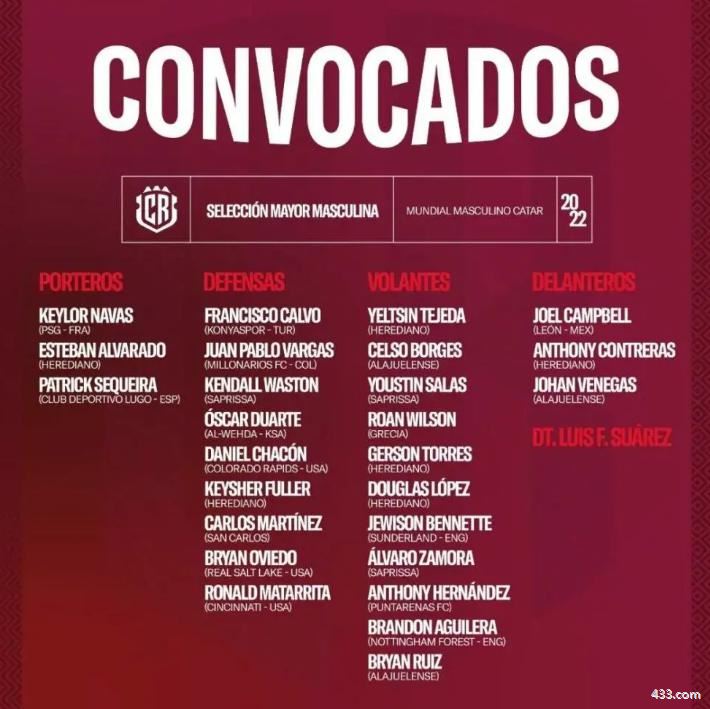 哥斯达黎加公布球队卡塔尔世界杯大名单,共计26人入选,来自巴黎圣日耳曼的门将纳瓦斯领衔。