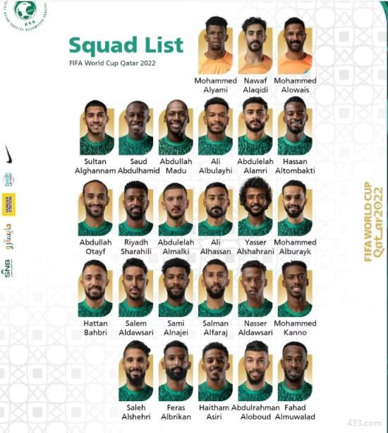 这份名单中的26人均来自沙特本国联赛,其中12人来自利雅得新月队。卡塔尔世界杯,沙特队与阿根廷队、墨西哥队、波兰队同分在C组。