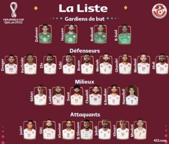 突尼斯世界杯大名单门将:1-A-马斯卢蒂(沙希尔星)、16-达门(斯法克西恩)、22-本-赛义德(莫纳斯蒂尔)、26-哈桑(非洲之鹰)