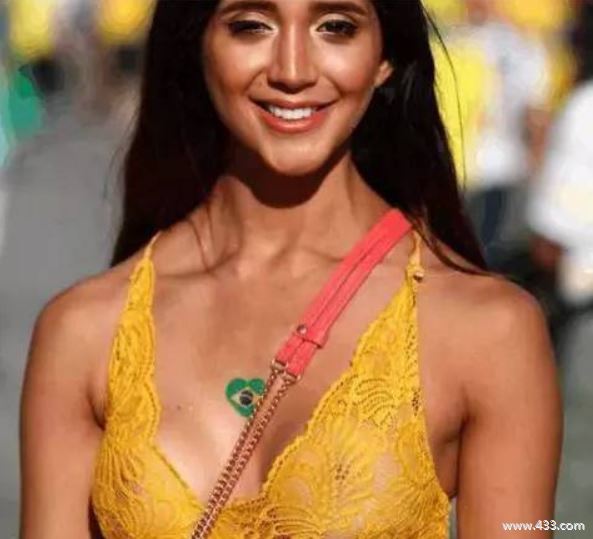 巴西队战胜塞尔维亚晋级淘汰赛,让球迷们喜笑颜开,而这位女球迷相当扎眼,蕾丝上衣亮点十足,甜美的笑容让人过目难忘。