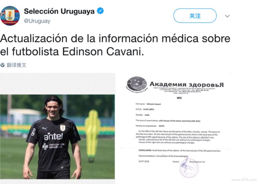 根据乌拉圭足协公布的信息显示,卡瓦尼左小腿肠肌水肿,大概在左小腿肚子处。好在肌肉没有出现撕裂的情况,并且没有骨折。但球员仍然感到疼痛,尚不知可否迎战下一轮的比赛。