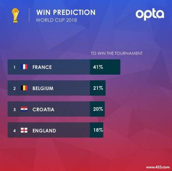 OPTA是国外著名的数据公司,他们的数据服务于各大联赛,有着很大的权威性。日前,OPTA统计利用自己公司大数据,模拟出了世界杯四强的夺冠概率。法国以41%的排名第一位,比利时以21%排名第二位,克罗地亚以20%排名第三名,英格兰的夺冠希望仅为18%,排名最后一位。