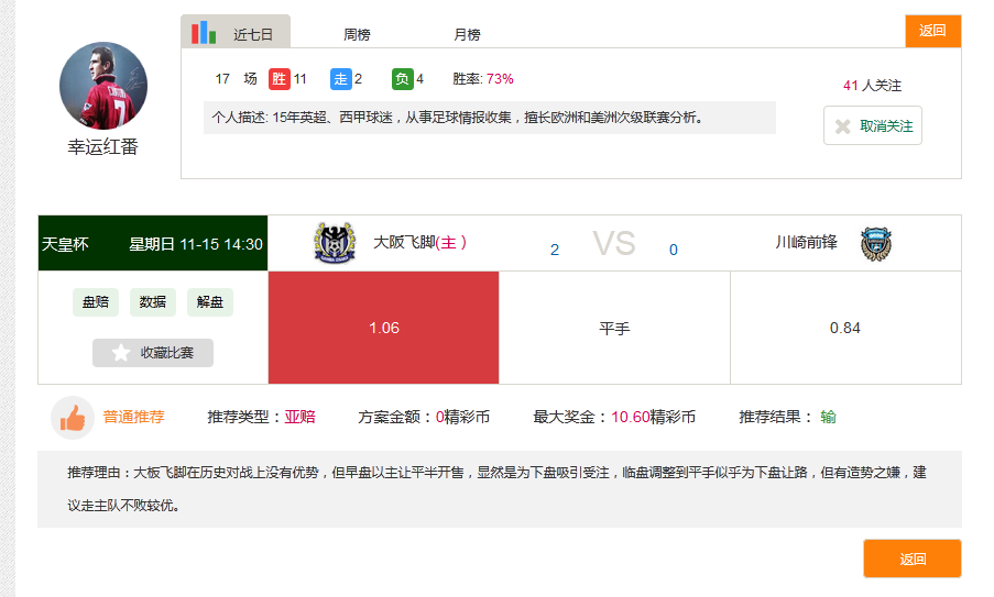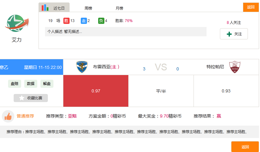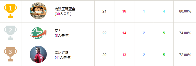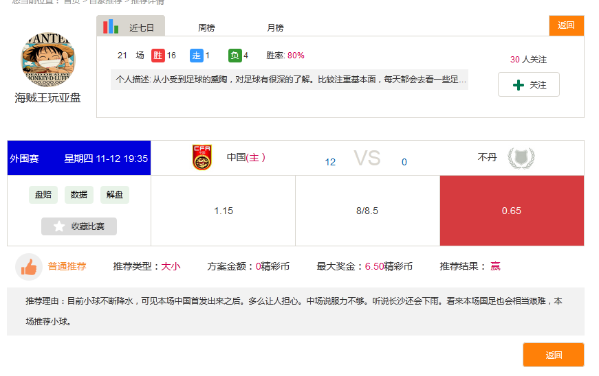 但某细心的玩家发现,第一名的推荐中有场比赛出现了BUG(如上图)。因此,玩家海贼王玩亚盘的真实战绩应为15胜1走5负,胜率为75%。
